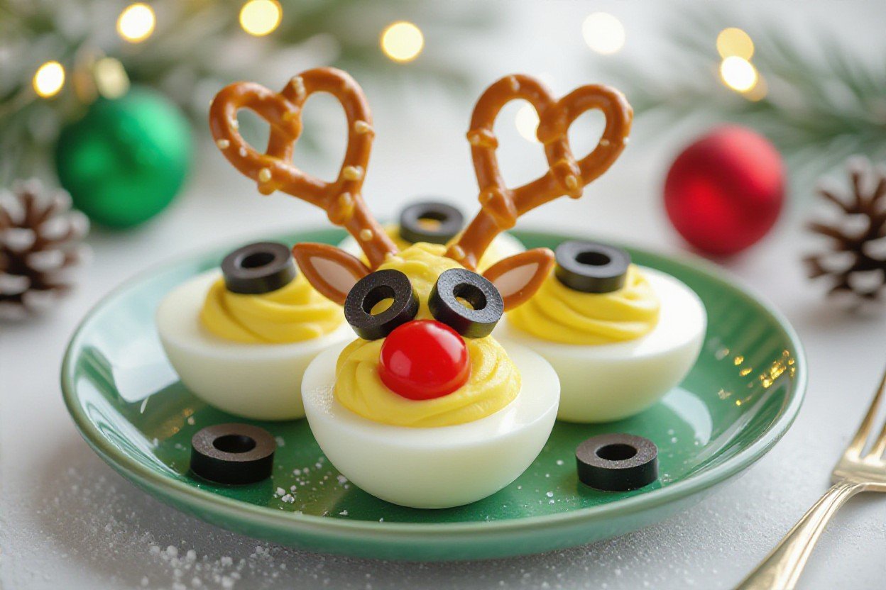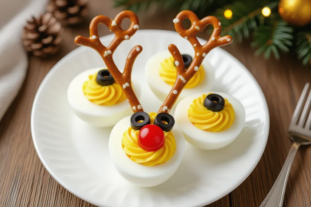 Most people hear “deviled egg reindeer” and picture some complicated Pinterest-only fever dream, but you’re really just talking about regular deviled eggs dressed up like little cartoon reindeer faces. You still start with the classic base: halved hard boiled eggs, yolks mixed with mayo, mustard, a splash of vinegar, salt, pepper, maybe a touch of paprika. Then you layer on the reindeer details – pretzel twists or sticks for antlers, sliced black olives or peppercorns for eyes, and a cherry tomato, piece of red pepper, or even a tiny radish slice for that Rudolph nose. In other words, you’re not reinventing the recipe so much as upgrading the presentation.