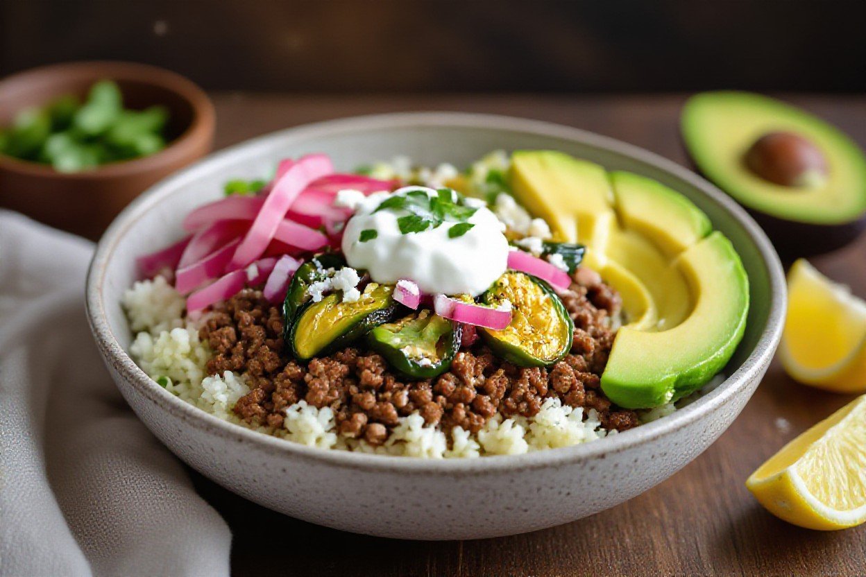 Pair your burrito bowl with low-carb bases and bright, acidic toppings to balance the richness of the beef: 1 cup cauliflower rice (≈3 g net carbs) or a crunchy shredded cabbage slaw work well, while pickled jalapeños, lime wedges, and a spoonful of pico de gallo add acidity without many carbs. Add one-half avocado for creaminess-about 10-12 g fat and roughly 2 g net carbs per half-to boost satiety, or sprinkle 1 oz cheddar (≈9 g fat, 7 g protein, <1 g carbs) or crumbled cotija for a salty finish.