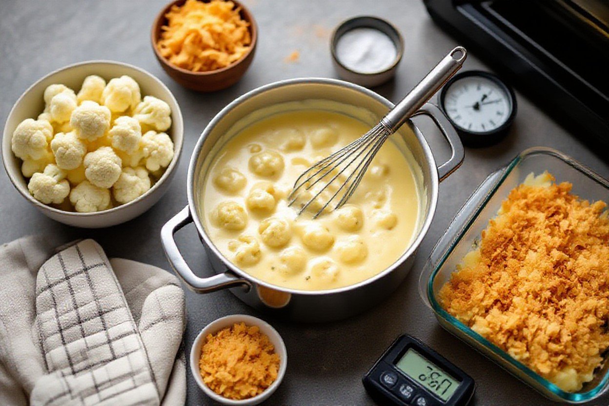 | Combining and Baking | Toss cauliflower with about ¾ of the sauce, transfer to a 9×13″ (23×33 cm) dish, top with remaining sauce and ½ cup extra cheddar. Bake at 400°F (200°C) for 10-12 minutes until bubbling; broil 1-2 minutes for color. Let rest 5-8 minutes before serving. |