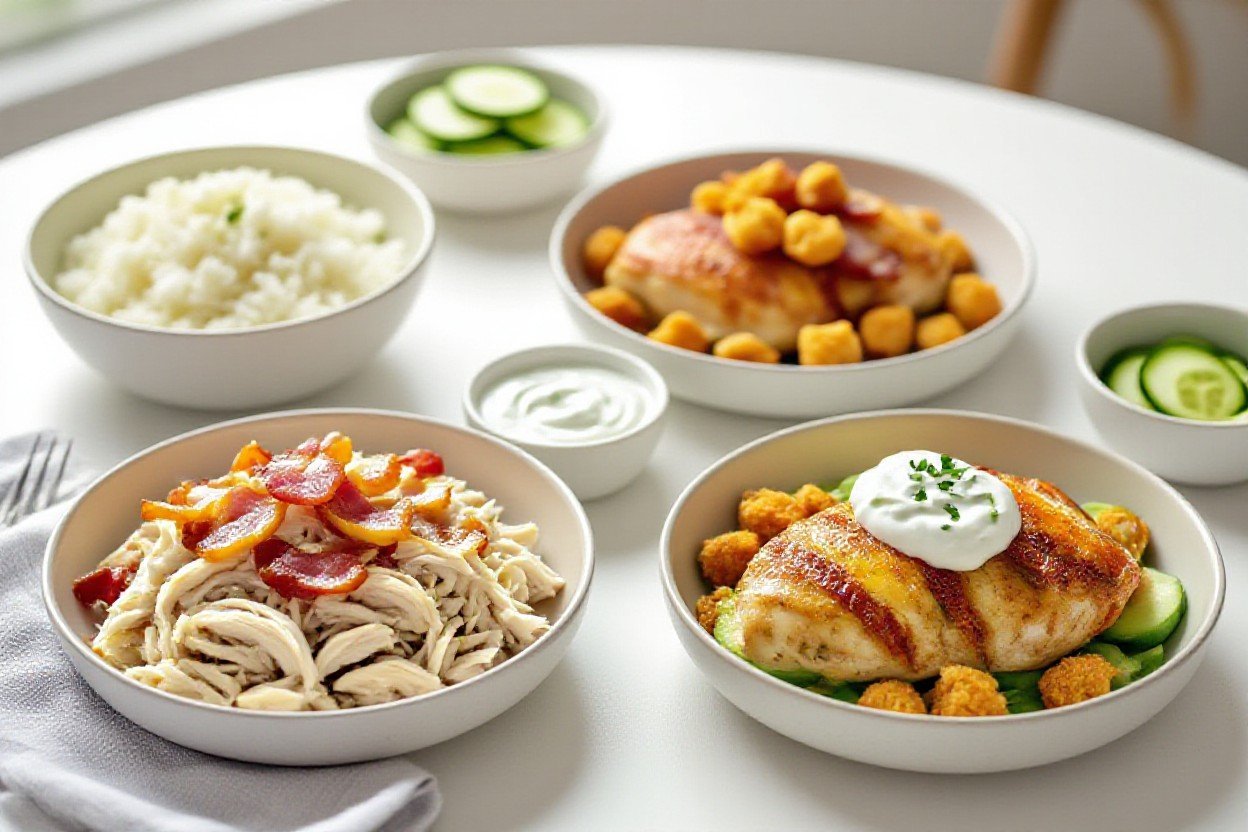 Swap the grilled chicken for salmon, shrimp, turkey or pulled pork to change flavor and fat content: a 3 oz cooked chicken breast gives about 26 g protein, 3 oz salmon ~22 g, and 3 oz shrimp ~20 g. You can use smoked salmon or canned tuna for no-cook convenience-canned tuna (drained) also delivers roughly 20-22 g protein per 3 oz and pairs well with the ranch and bacon for a quick, high-protein bowl. If you prefer plant-based, press and pan-sear extra-firm tofu or slice tempeh; 4 oz firm tofu provides around 8-10 g protein, so increase portion size or add avocado and extra-fat dressing to hit keto fat targets.