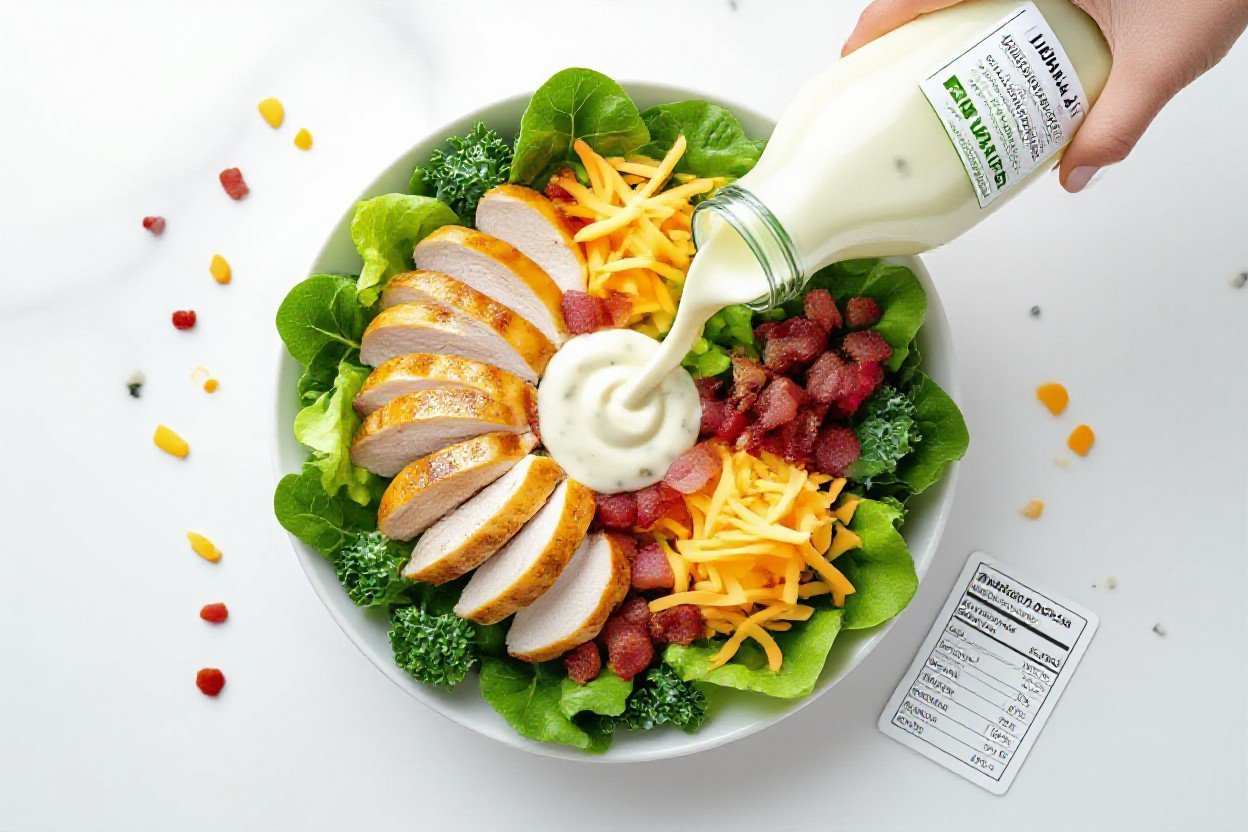 Stick with a keto-friendly ranch base using full-fat mayonnaise and sour cream: for four servings mix ½ cup mayo, ¼ cup sour cream, 2 tbsp heavy cream (or water for a lighter pour), 1 tsp garlic powder, 1 tsp onion powder, 1 tbsp chopped dill and 1 tbsp chopped chives; this yields roughly ¾-1 cup of dressing and keeps carbs near zero. Full-fat mayo runs about 100 kcal and 11 g fat per tablespoon, so factor portions into your meal-two tablespoons of this ranch will add roughly 200 kcal and 22 g fat.