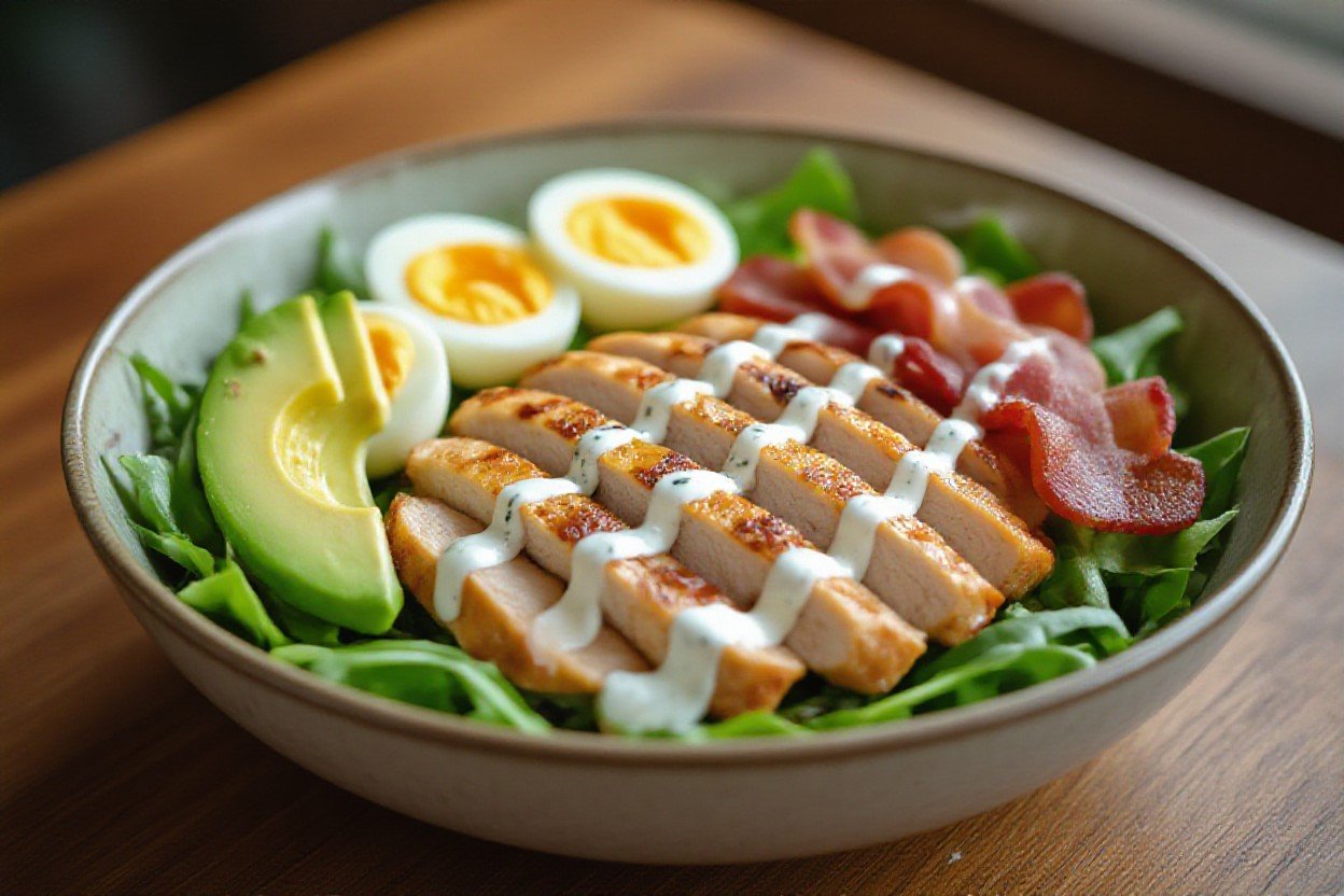 Use about 4 cups mixed greens for 2-3 servings, then layer 8 oz sliced chicken, 4 chopped bacon slices, 1 cup halved cherry tomatoes, 1/2 cup shredded cheddar and 1/4 cup sliced green onions; toss with 2-3 tablespoons of full-fat ranch or 1/2 cup homemade keto ranch (1/2 cup mayo, 1/4 cup sour cream, 1 tbsp apple cider vinegar, dill and chives to taste) to coat evenly without wilting the greens. Add avocado slices last to avoid browning and distribute protein evenly across the bowl for balanced bites.