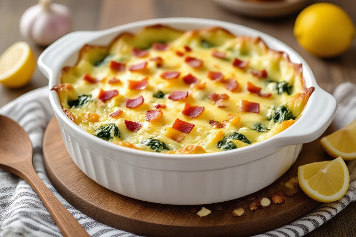 Preheat the oven to 375°F (190°C) for a standard 9×13-inch dish and plan on 25-30 minutes until the center is set and the top is lightly golden; the internal temperature should reach about 160°F (71°C) for a safely set egg-based bake. For individual ramekins or smaller portions, reduce the time to 18-22 minutes at 375°F; a deep-dish or very full casserole may need 30-35 minutes at 350°F to avoid over-browning the top while the center finishes cooking.