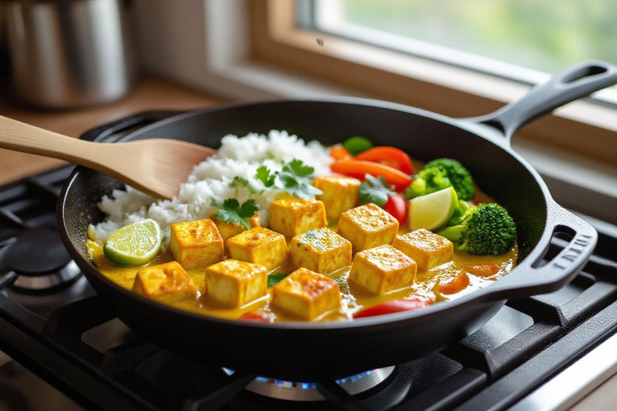 When building the curry, finish the tofu in the sauce for 3-5 minutes so it rehydrates and absorbs flavor without falling apart; deglaze the pan with 1/4-1/2 cup of coconut milk or stock to lift browned bits and concentrate taste by simmering 6-8 minutes. Choose a cast-iron or heavy stainless skillet if you want the most even browning and transfer finished cubes to a wire rack while you reduce the sauce to keep them crisp.