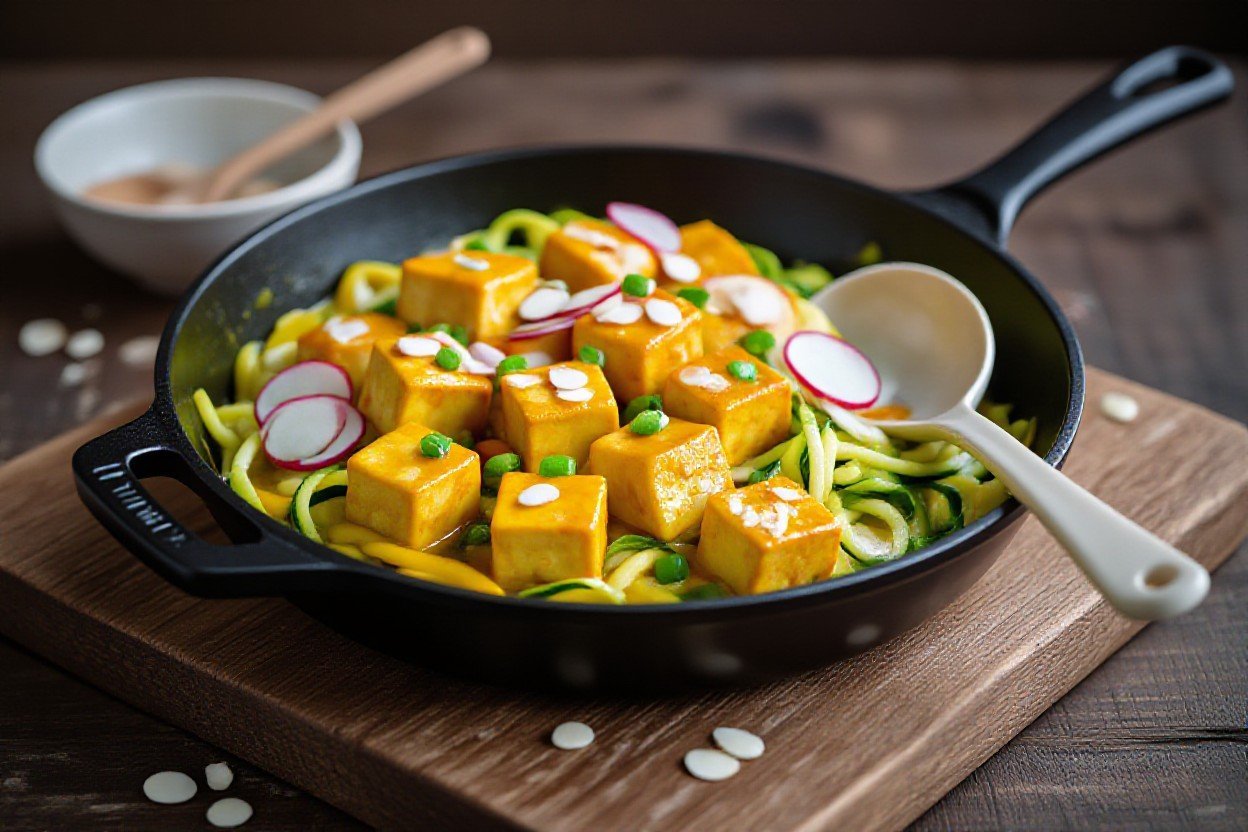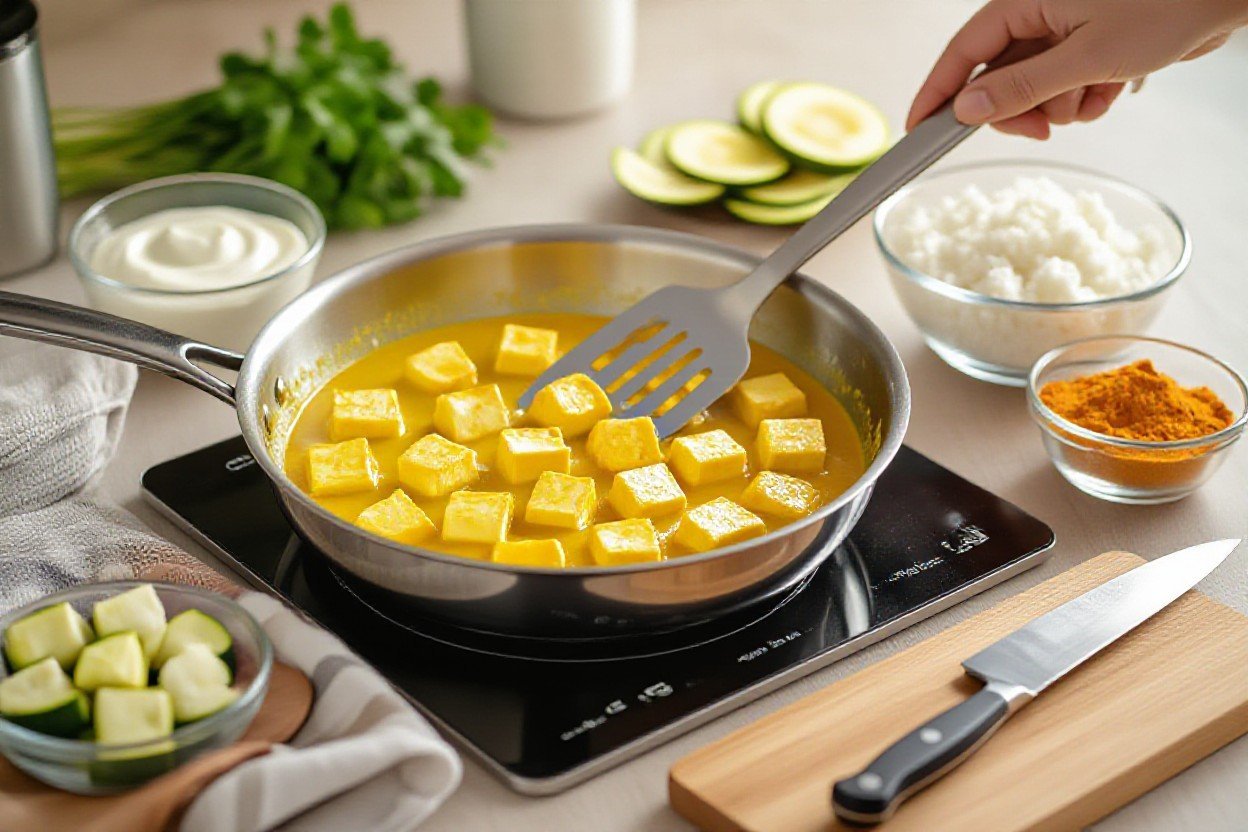 Once the vegetables are nearly done, lower the heat to medium and add your spices and liquids-start with 1-2 tablespoons curry powder or 2 tablespoons red curry paste, plus 1/2 to 1 cup (120-240 mL) full-fat coconut milk for a creamy, low-carb sauce-stir to coat and bring to a gentle simmer for 3-5 minutes so the flavors meld. Gently return the seared tofu to the skillet and fold it in, taking care not to break the cubes; heat through for 2-3 minutes so the tofu absorbs some sauce without falling apart.