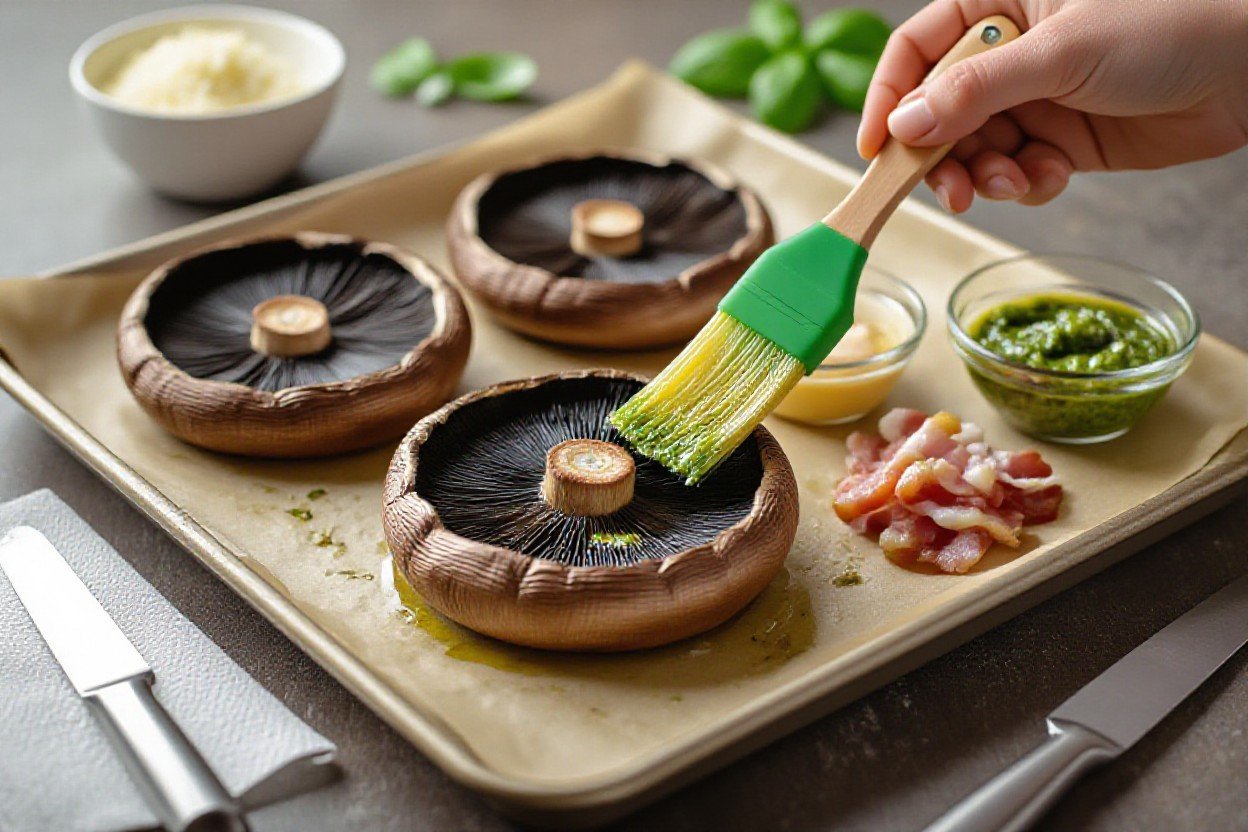 Remove the dark gills with the edge of a spoon to create more surface area and reduce moisture beneath the toppings, especially if you plan a wet sauce. Trim the stem flush for a flat surface and save the trimmed stem: dice and sauté with 1 tbsp olive oil and a clove of minced garlic for 3-4 minutes to use as a flavorful filling or topping. Lightly brush both sides of each cap with about 1 tsp olive oil and season with 1/4 tsp salt and 1/8 tsp black pepper per cap; let sit 10-15 minutes to let the seasoning penetrate.