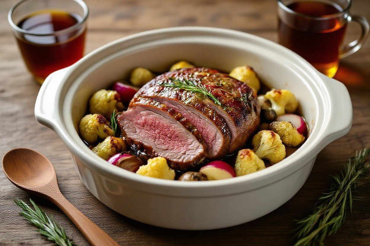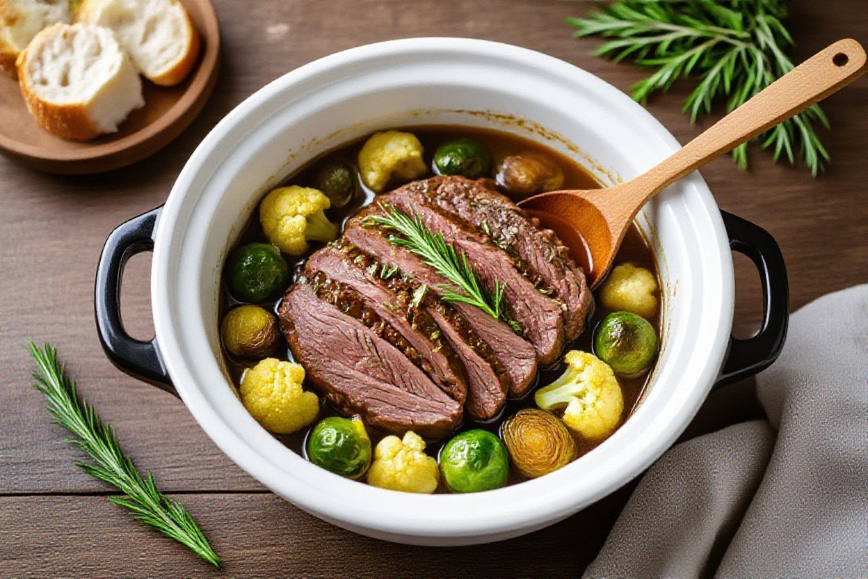 Keep added liquid modest – typically 1 to 1.5 cups for a 3-4 lb roast – since the cooker traps steam and you don’t need to submerge the meat. Place hearty root vegetables like carrots and turnips underneath the roast in 1-1.5 inch chunks so they cook through without turning mushy, and add mushrooms or delicate greens in the last 30-60 minutes. For a keto-friendly gravy, thicken pan juices with 1/8-1/4 teaspoon xanthan gum whisked into 1 cup of warm jus instead of flour or cornstarch.