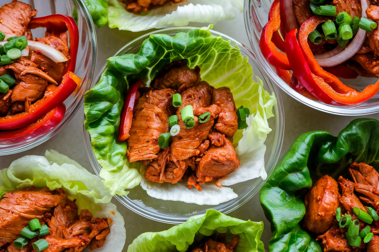 This dish isn’t “healthy but sad.” It’s healthy and obnoxiously good. The spicy-savory chicken is slicked with a glossy sauce that clings just right, then tucked into crisp lettuce like a street taco went on a wellness retreat.